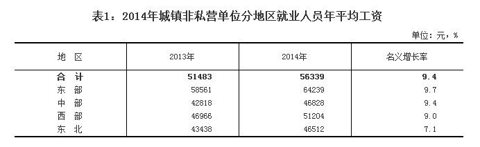 分四大区域看,2014年城镇非私营单位就业人员年平均工资由高到低排列是东部、西部、中部和东北,分别为64239元、51204元、46828元和46512元;同比名义增长率从高到低依次为东部9.7%、中部9.4%、西部9.0%和东北7.1%。 |